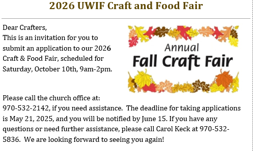 EVENTS Facebook Youtube CHURCH CALENDAR UWIF Annual Women's Luncheon All Faith Day of Prayer UWIF Annual Fall Food & Craft Fair UWIF Annual Fall Craft & Food Fair Application